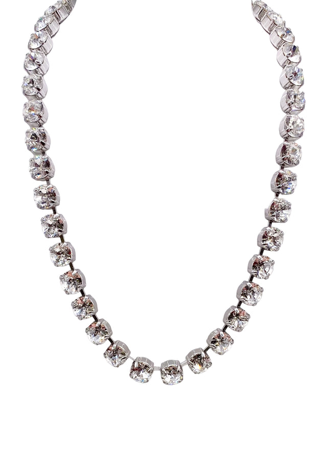 The Matilda Tennis Necklace features a repeating line of round cut crystals on an adjustable chain, secured with a lobster claw clasp. This necklace is a stunner and will be a favorite.