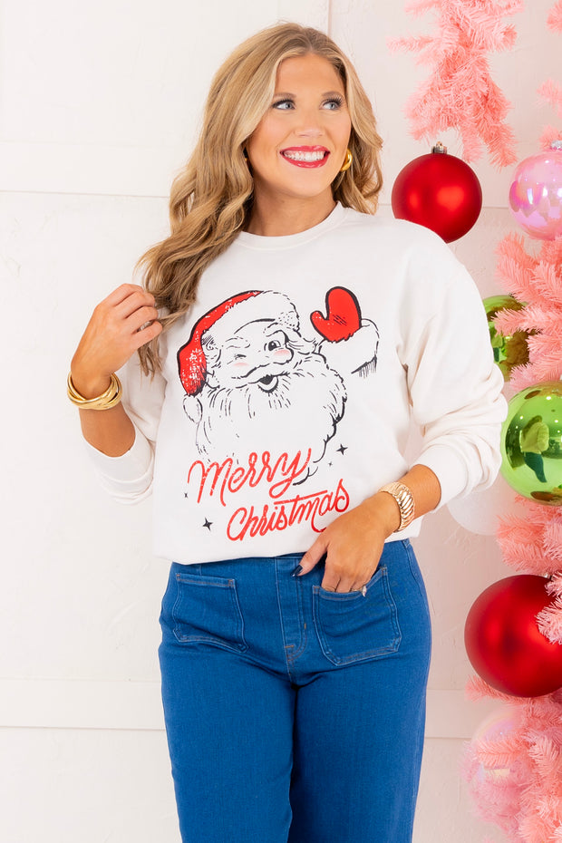 This festive sweatshirt features a rounded neckline and long sleeves for a comfortable fit. The fleece inner lining offers warmth, making it perfect for colder weather. The Santa graphic on the front adds a touch of holiday cheer to your wardrobe.