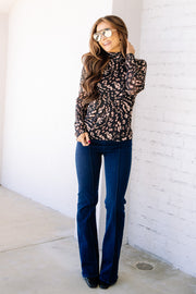 This long sleeve layering top features a comfortable mock neckline and a waist-length cut. Made from breathable mesh material, it showcases a unique abstract print that adds subtle style to any outfit.