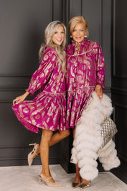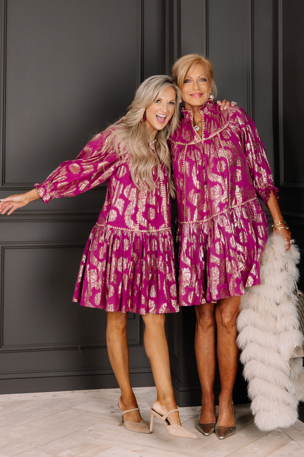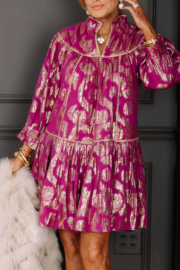 Holiday Wishes Raspberry and gold Rose Long Sleeve Dress