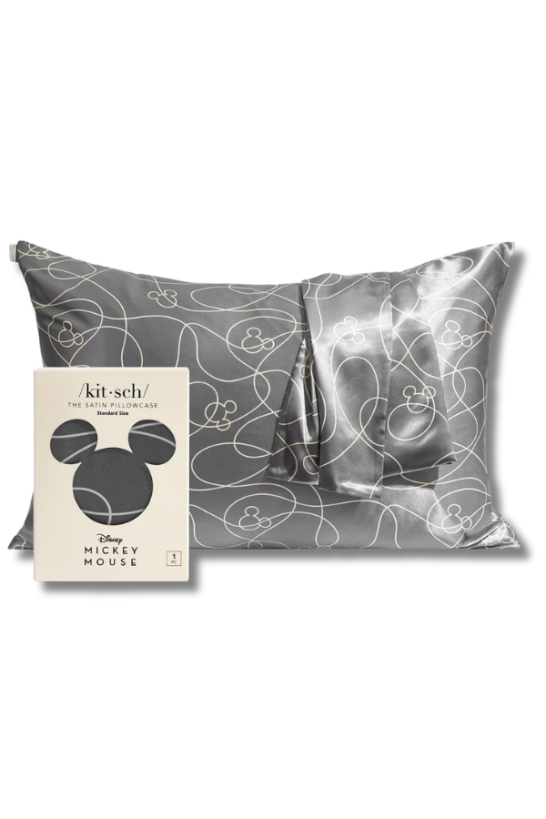 Get some beauty sleep with this satin pillowcase featuring playful line drawings of your best friends, Mickey