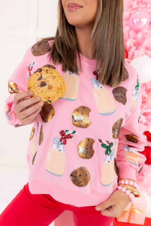 Stay cozy and stylish with the Milk & Cookies sweatshirt from Queen Of Sparkles. This sweatshirt features a rounded neckline and long sleeves, perfect for cooler weather. The fleece inner lining provides warmth and comfort, while the sequin cookies and milk design adds a touch of fun to your outfit.