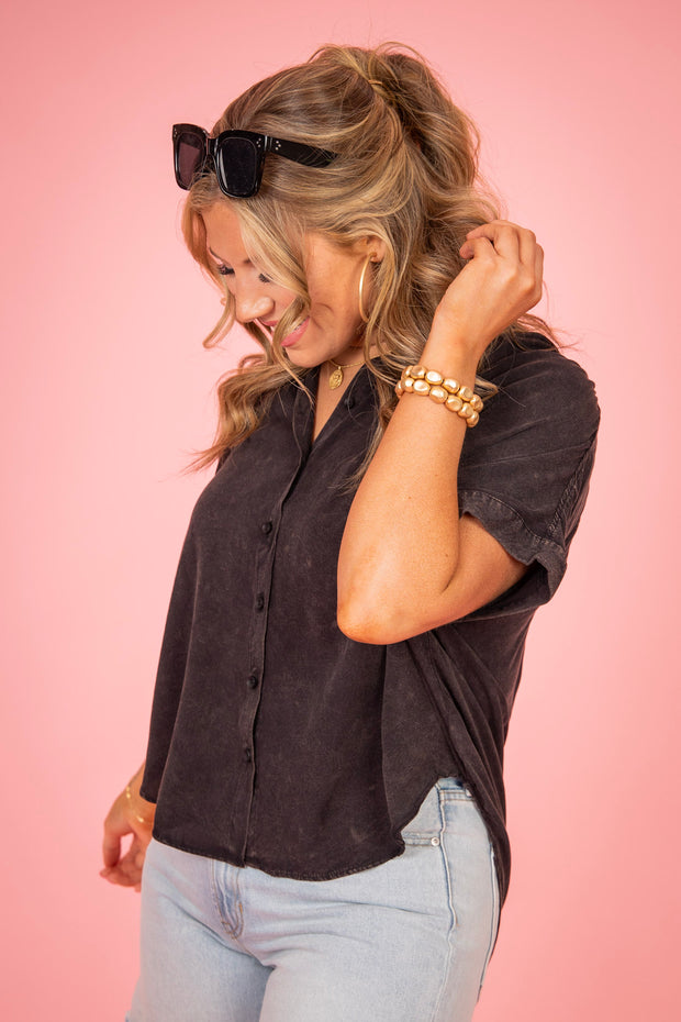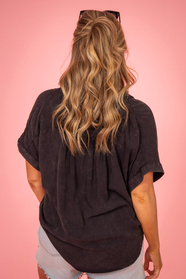 Introducing the From The Start Top in Ash Black. This top features a modern button down design and an on-trend acid wash finish. With a comfortable oversized fit and short sleeves, it's perfect for any occasion. Upgrade your wardrobe with this stylish and versatile top.