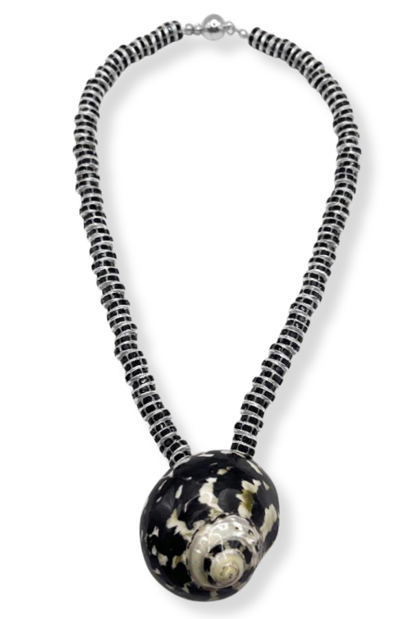 Add a touch of elegance and sophistication to any outfit with This Shell Necklace. The magnetic silver and black beaded oversized shell necklace exudes a modern yet timeless look. Its unique design will surely make a statement and elevate your style.