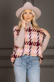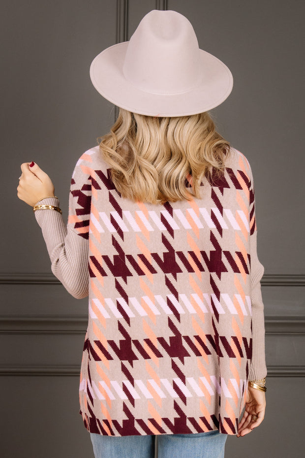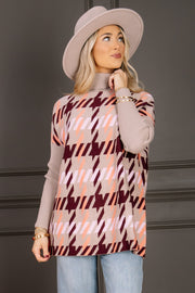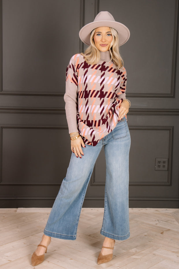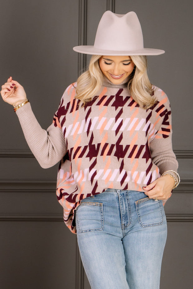 Cozy houndstooth sweater featuring a classic turtle neckline and long sleeves. Perfect layering piece in mocha heather tones for effortless autumn style.