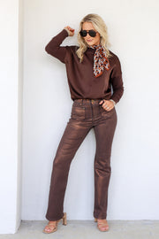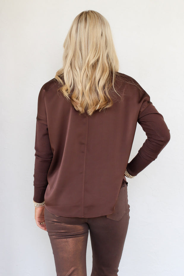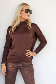 The Lucie blouse in mocha brown features a mock neck and long sleeves with a sweater-like texture. Made from breathable satin-like fabric, it offers both comfort and style for everyday wear.