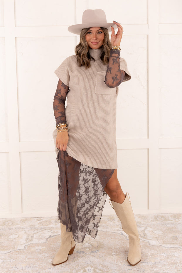 Upgrade your wardrobe with our Clean Slate Sweater Dress. Featuring a mock neckline and ribbed material, this dress offers a chic and cozy look. The short sleeves and convenient front pocket make it a perfect choice for any occasion. Stay stylish and comfortable with this versatile dress.