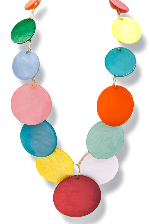 Featuring a beautiful assortment of Celluloid Acetate disc charms. This statement necklace will add a touch of elegance to any outfit. It is lightweight and comfortable to wear.