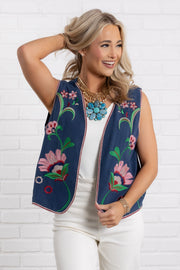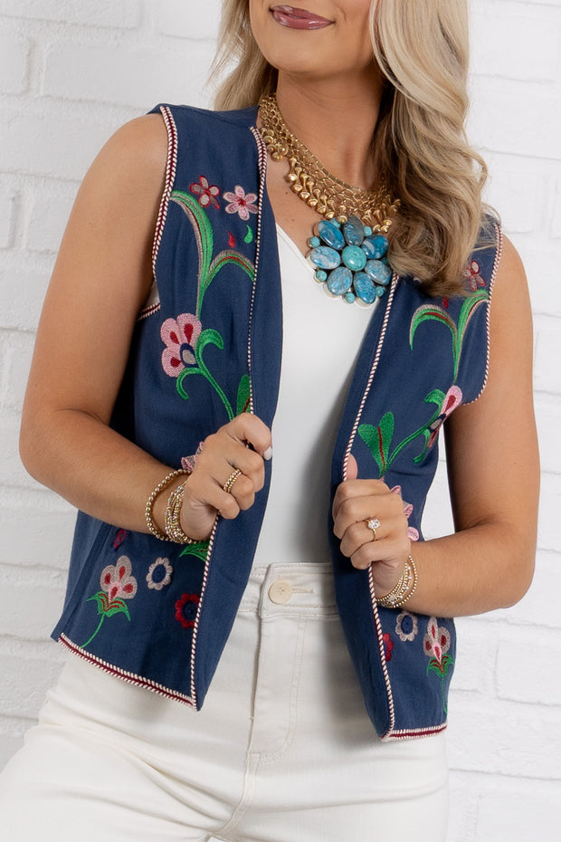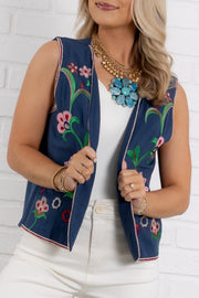 Featuring an open front and waist length design, this vest adds a touch of sophistication to any ensemble. The sleeveless style allows for easy layering and the embroidered detailing adds a unique and elegant touch.