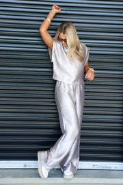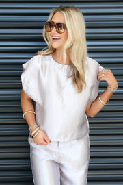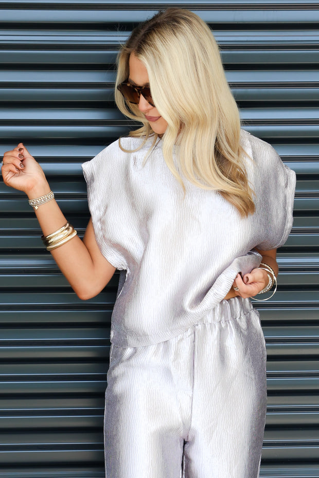 The We Can Be Silver Metallic Short Sleeve Top features a round neckline and a button back closure for easy wear. Its metallic finish makes it a perfect statement piece while serving as a versatile wardrobe staple.