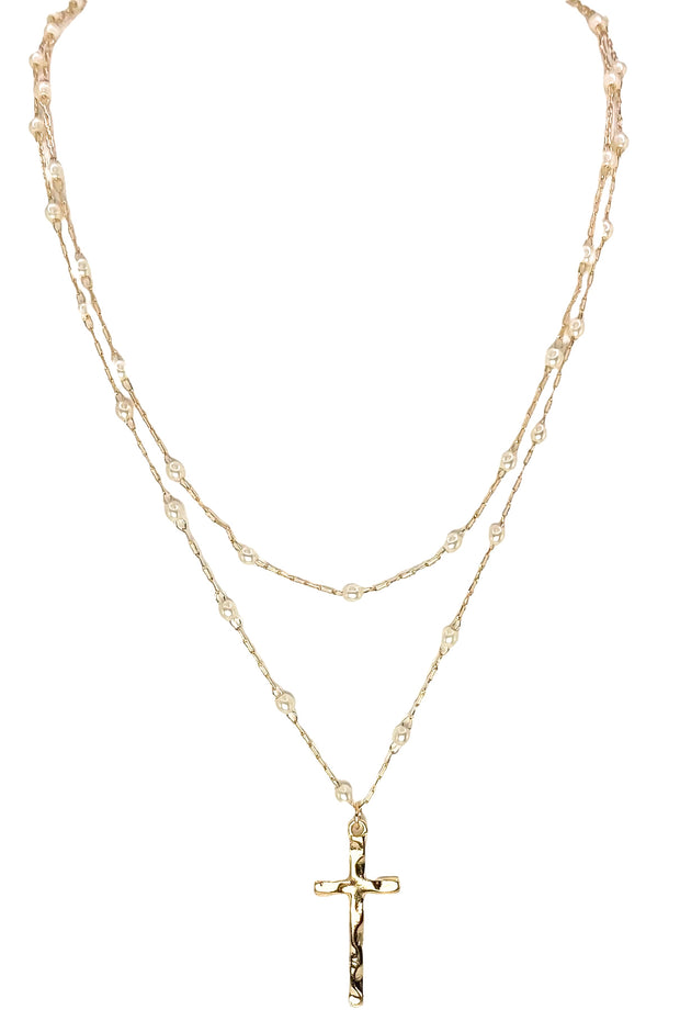 This elegant necklace features a double strand design with beautiful pearl accents, creating a sophisticated look. The addition of cross pendants adds a touch of faith and meaning to any outfit. Perfect for those looking to lead the way with style and grace.