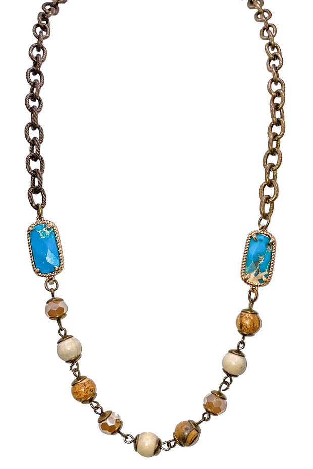 Enhance your wardrobe with our Standing Strong Necklace. This chain link necklace boasts a stunning turquoise centerpiece, accented with delicate beading. Perfect for any occasion, this accessory adds a touch of elegance to any outfit. Elevate your style and stand out in the crowd with our unique design.