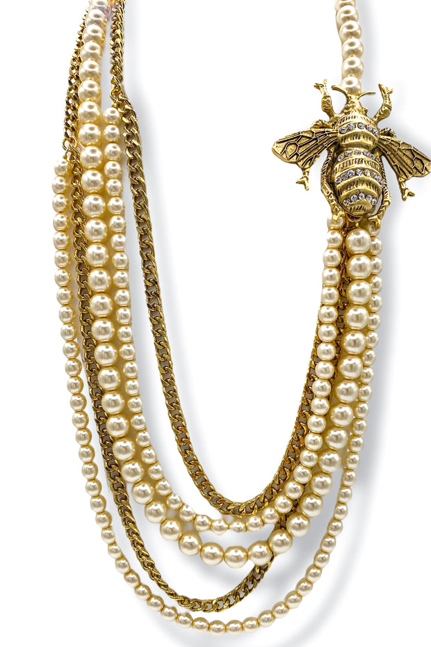 Featuring a stunning bee brooch with intricate detailing, adorned on a delicate pearl and chain statement necklace. Expertly crafted, this necklace adds a touch of elegance and sophistication to any outfit. Elevate your style with this unique and timeless piece.