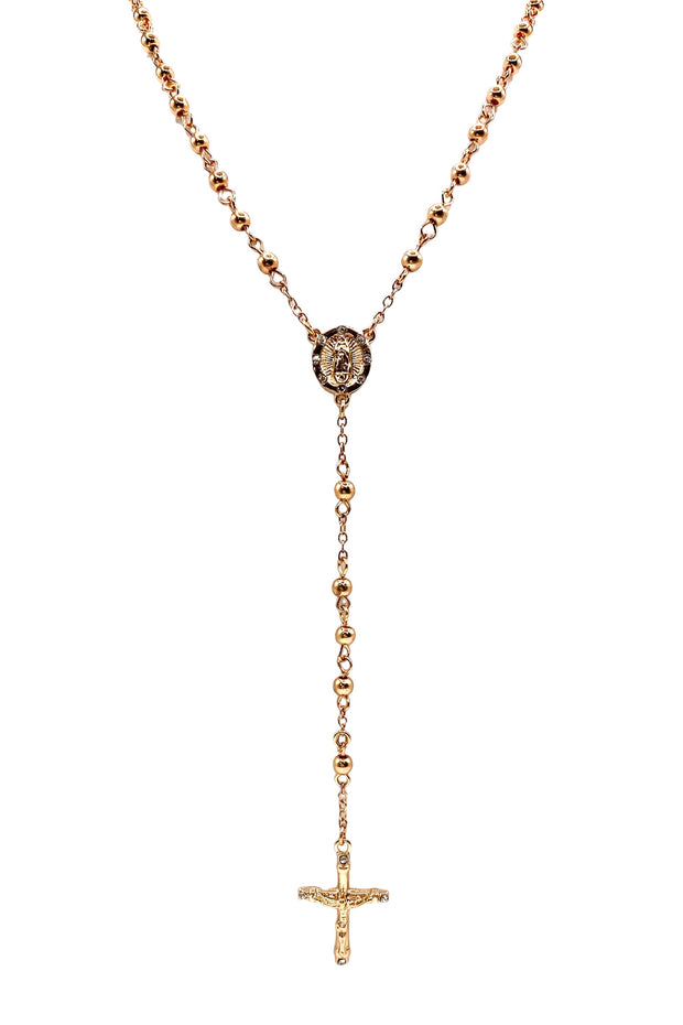 Chosen Necklace is a beautiful beaded chain necklace that features a stylish cross and Mother Mary pendant. Its intricate design adds a touch of sophistication to any outfit. This accessory is sure to last for many years