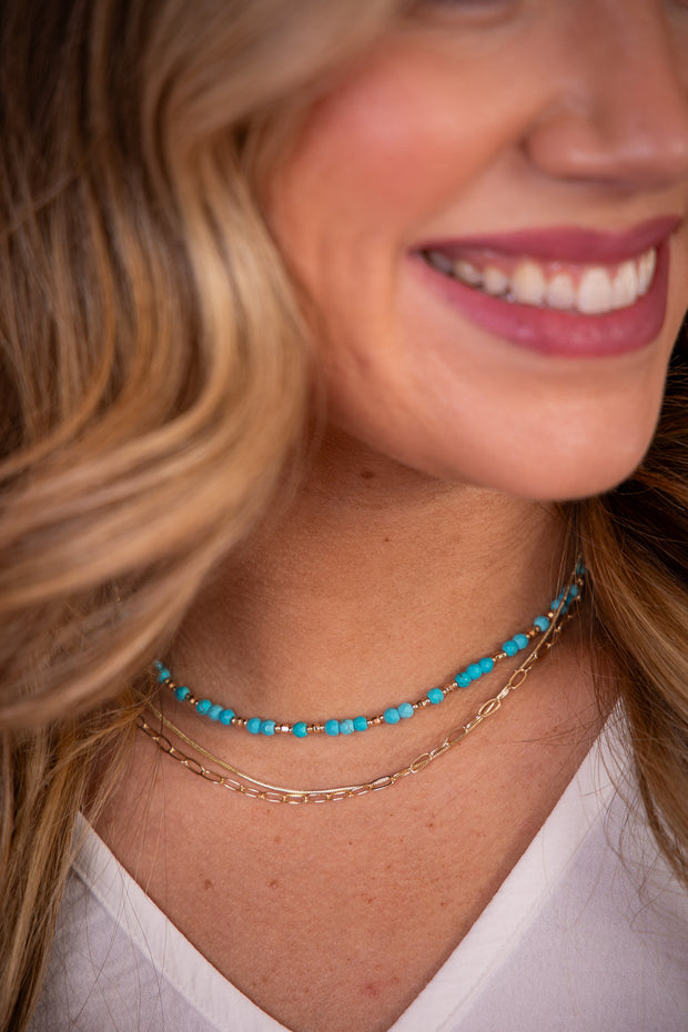 The Bring Back Memories Necklace features a layered design with one chain necklace, one snake chain, and one beaded chain. Experience a sense of nostalgia with this versatile piece that can be dressed up or down for any occasion.