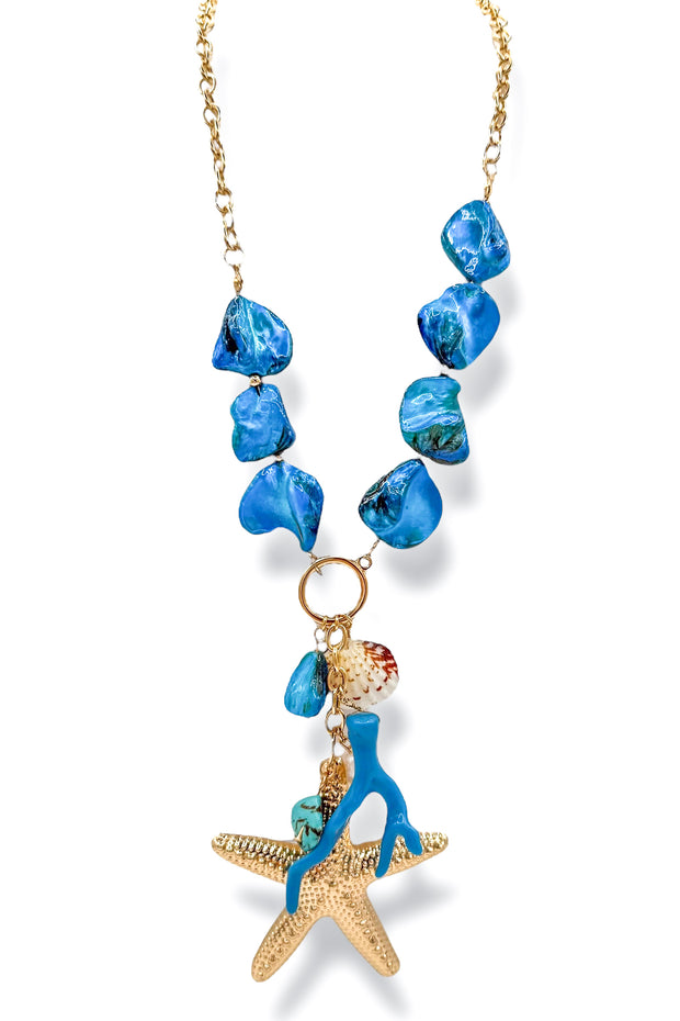 Explore the beauty of the ocean with our blue seashell and starfish necklace. Adorned with pearls and a striking turquoise stone, this statement piece is perfect for adding a touch of elegance to any outfit. Embrace the calming and natural vibe of the sea with this stunning necklace.