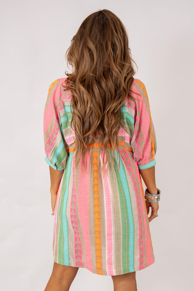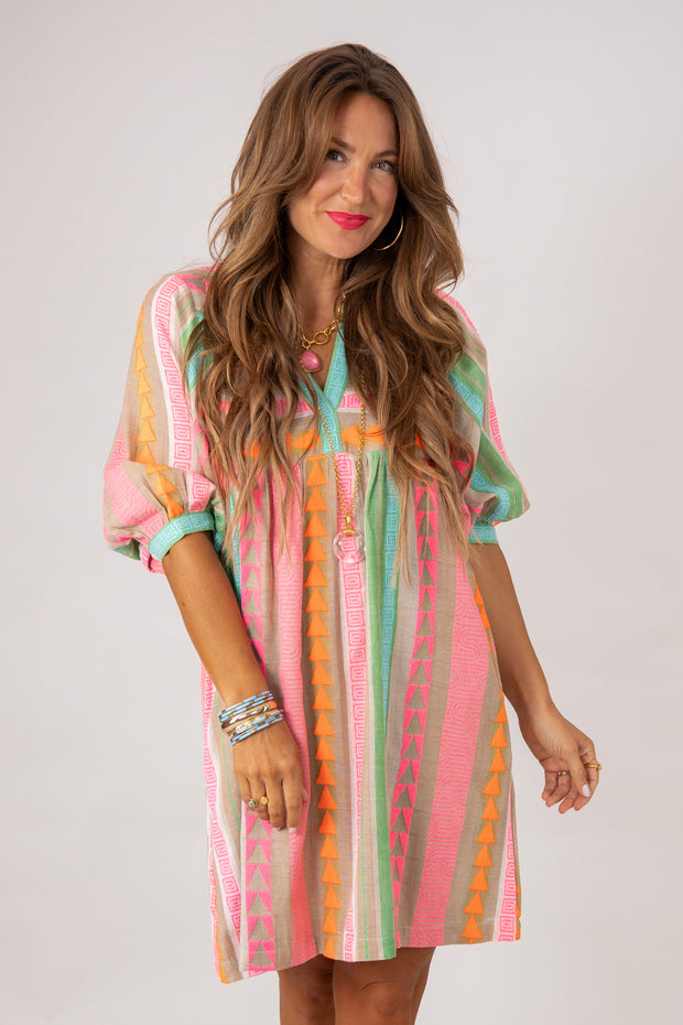This Going Global Dress features a bold Aztec pattern in a vibrant color palette. The v neckline and 3/4 length sleeve add a touch of sophistication, making it a statement dress perfect for a variety of occasions. Stand out and make a statement with this eye-catching dress.