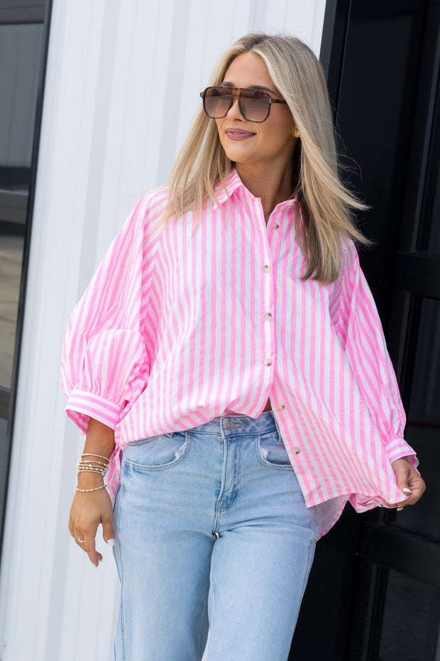 Featuring a top collar and button down front, this waist-length shirt is perfect for any occasion. The dolman sleeves add a touch of femininity, while the striped print adds a playful touch to your wardrobe.