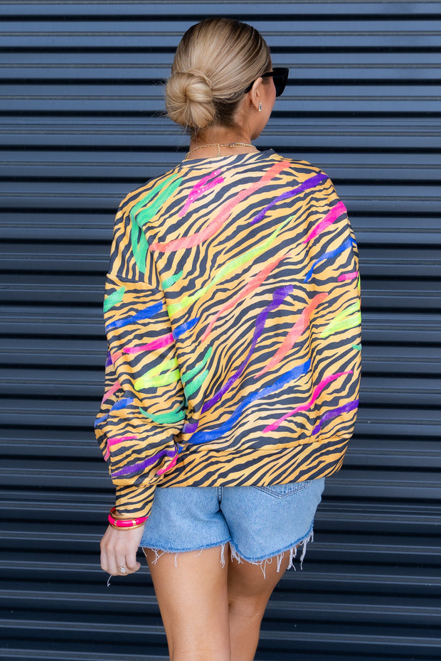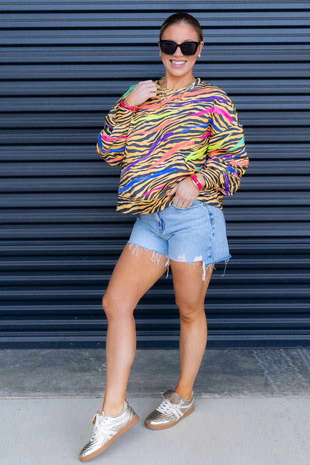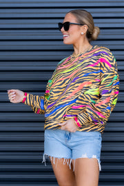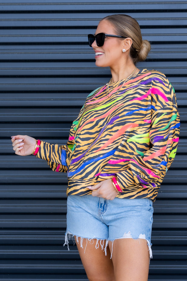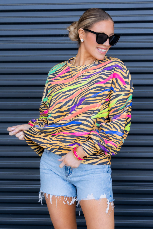 Featuring a rounded neckline, long sleeves, and a fierce zebra print, this sweatshirt will keep you cozy and stylish. Made of soft fleece material, it's the perfect addition to any fashion-forward wardrobe.