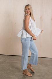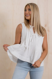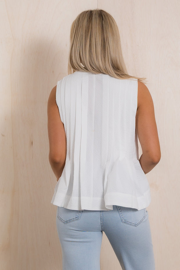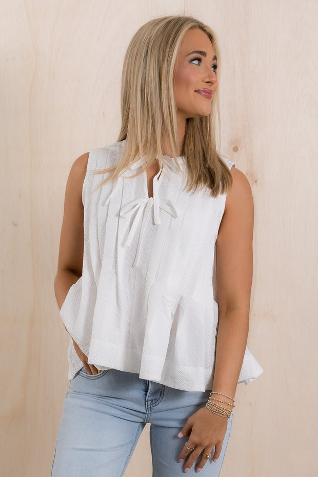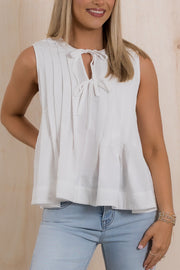 This Top showcases a modern design with its pleaded detailing and bow tie front. Made from a breathable material, it ensures comfort while remaining stylish. The sleeveless design adds versatility to your wardrobe.