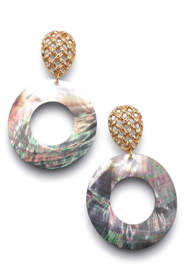 Experience elegance with our True Story Earrings. Made with woven metal studs and featuring an open round mother of pearl pendant, these earrings are the perfect addition to any outfit. Effortlessly elevate your style with the delicate design and timeless beauty of our earrings.