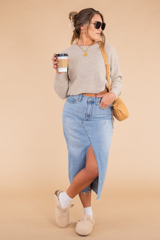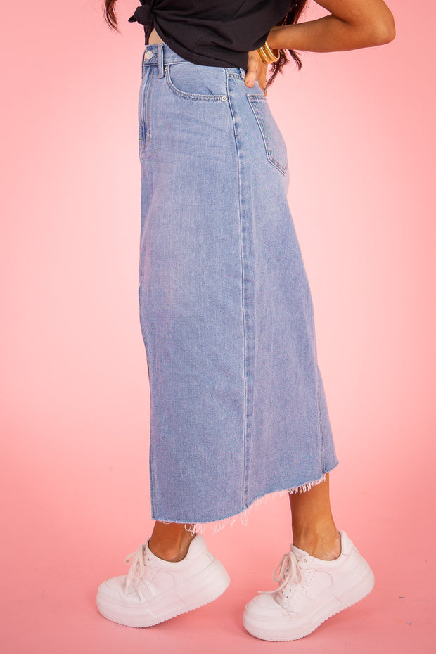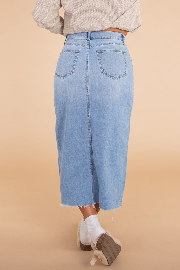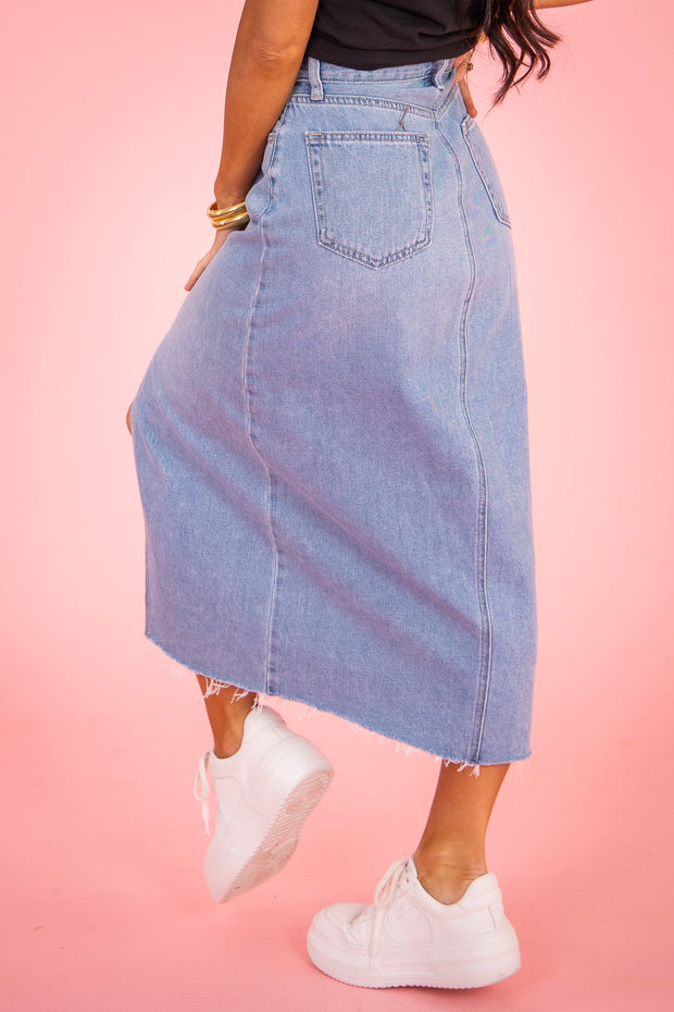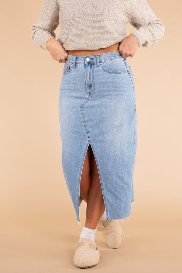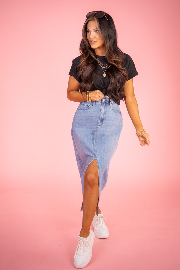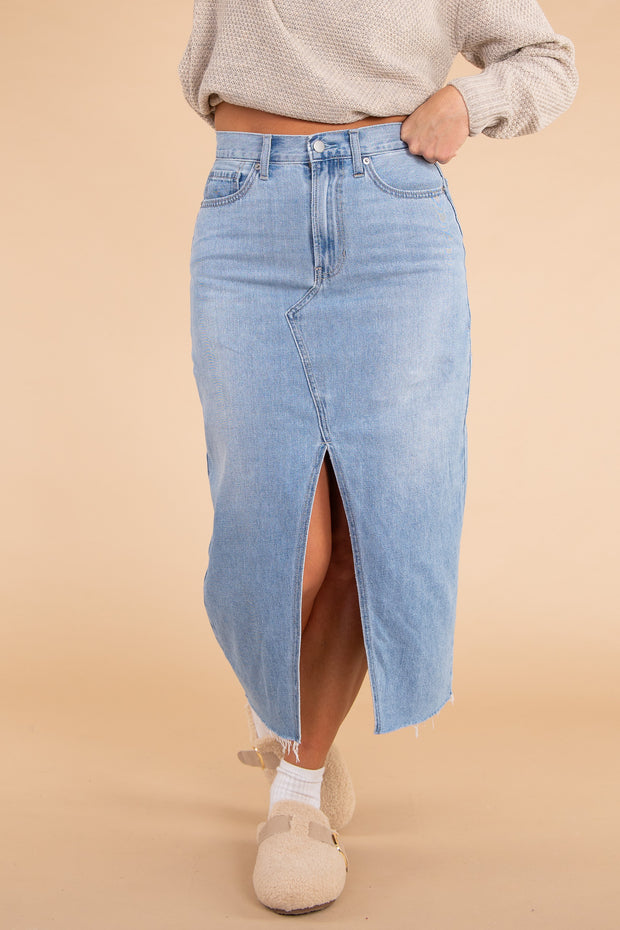 This midi skirt from In A Rush is ideal for creating an effortless, yet stylish look. Its denim material, no stretch, and midi length provide a versatile and secure fit. Additionally, functional pockets and a front slit add a modern touch. Dress it up or down with ease and look fashionable in a rush.