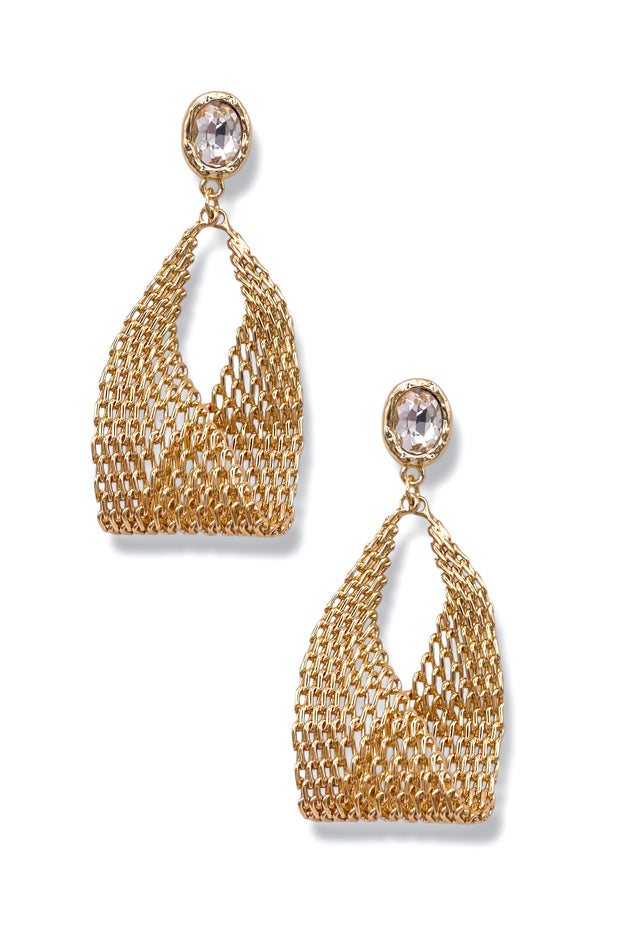 Featuring shimmering oval crystals and a delicate mesh chain, these earrings will add a touch of elegance and sophistication to any outfit. Elevate your style with these stunning accessories.