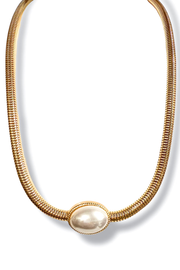 Elevate your style with this stunning necklace featuring an elegant oval pearl on a sleek snake chain choker—perfect for adding a touch of sophistication to any outfit.