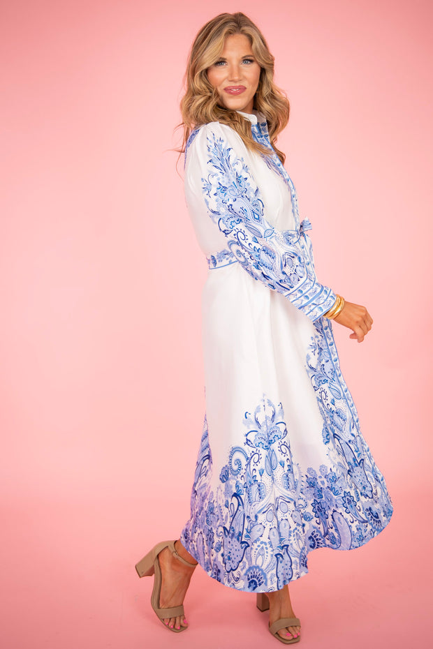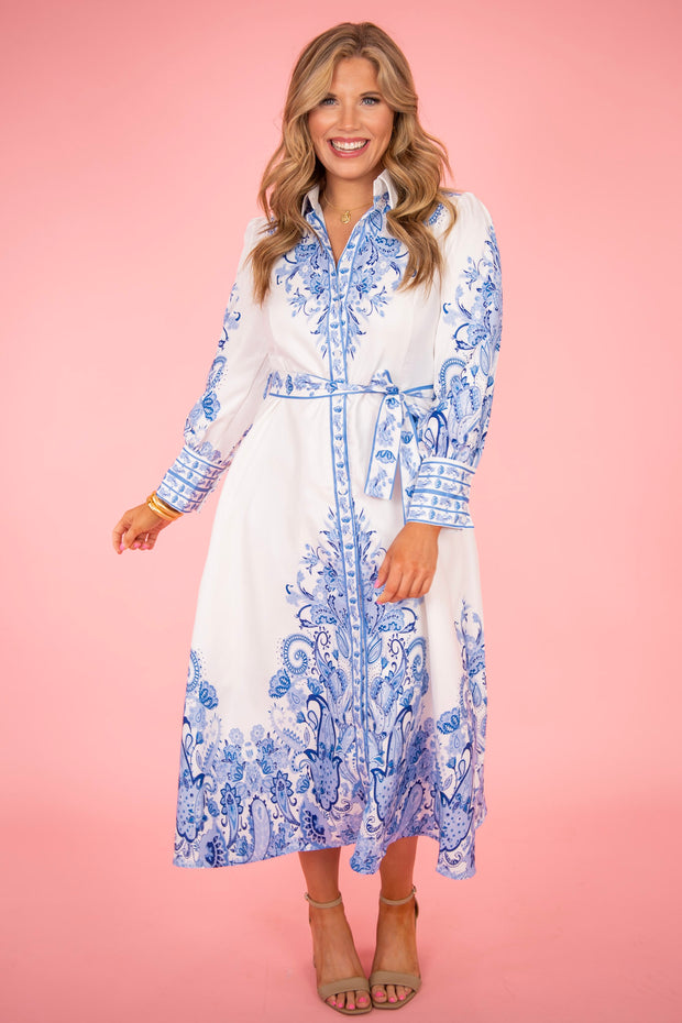 Introducing the East Hampton Dress - a perfect blend of style and comfort. With a classic top collar and long sleeves, this maxi dress features a beautiful paisley print and a button down front. The belted waist and inner lining ensure a flattering fit and added comfort. Elevate your wardrobe with this must-have dress.