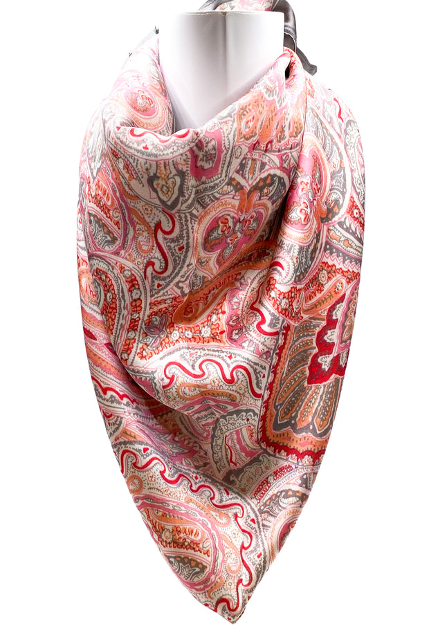 Introducing the Night Of Our Lives Scarf, a unique and stylish accessory for any outfit. Its pink and grey tone color palette, adorned with a paisley print, adds a touch of sophistication to your look. This scarf is perfect for any season and elevates any outfit to the next level.