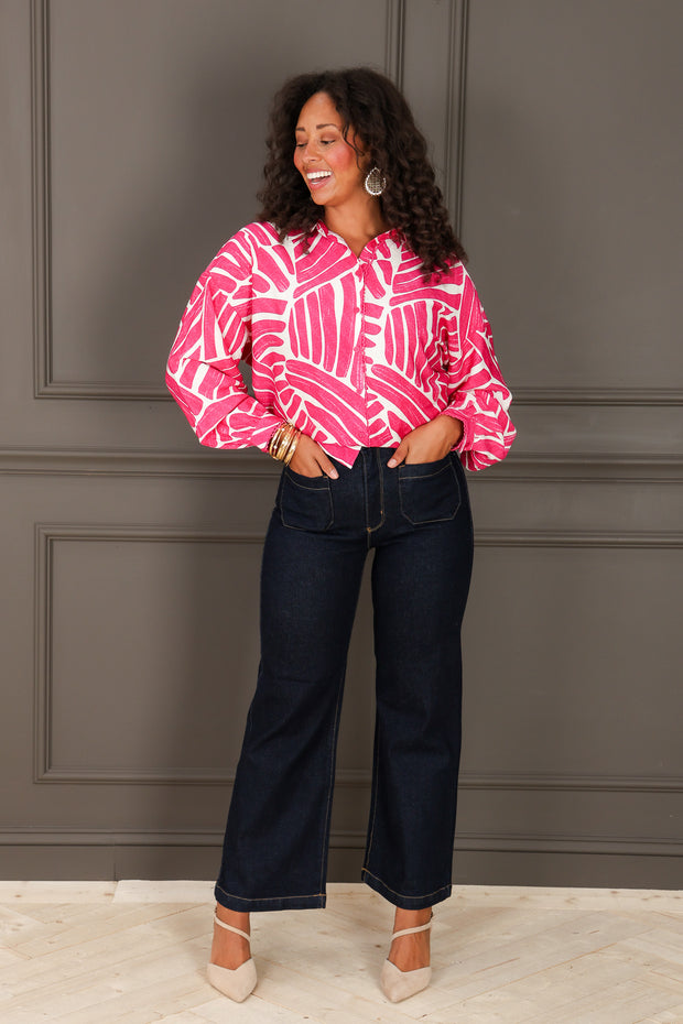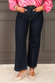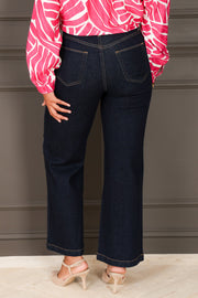 These Jeans offers a high waistband for a comfortable and flattering fit. Its wide leg silhouette provides ease of movement, complemented by practical side pockets. The dark wash gives a classic look, and the front zip with button closure ensures secure wear.