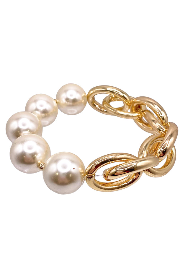 This elegant bracelet includes half a pearl beaded bracelet and half chain link bracelet, perfect for any occasion. The combination of these two intricate designs create a timeless accessory that adds a touch of sophistication to your outfit. Elevate your style in the moment with this stunning bracelet set.