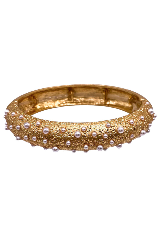 The Hear You Clear Bracelet is a sophisticated and elegant accessory, featuring a gold-textured design with delicate pearl detailing. Crafted with a keen attention to detail, this bracelet adds a touch of luxury to any outfit. Elevate your style with this timeless piece that will surely catch everyone's eye.