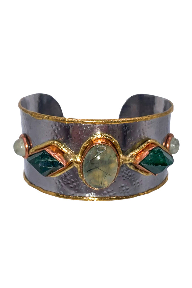 Expertly handcrafted, the Peggy Bracelet Cuff is a stunning piece made from hammered silver. Its intricate stone detailing adds a unique touch to this classic design. Elevate any outfit with this timeless and versatile accessory.