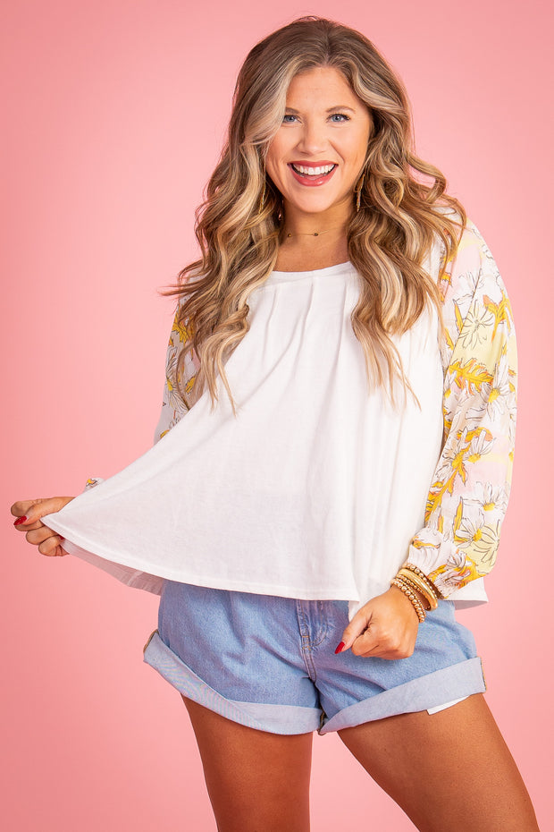 Upgrade your wardrobe with our Picking Petals Top by Free People. Experience the elegance and comfort of a pleated boat neckline, paired perfectly with charming floral patterned sleeves. The flowy fit adds a touch of grace to any outfit.