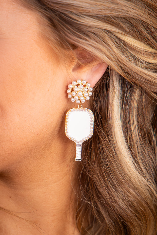 Elevate your pickleball style with our Pickleball Queen Earrings. These elegant pearl cluster studs feature a unique pickleball paddle dangle that will make a statement both on and off the court. Show off your love for the sport with this eye-catching accessory.