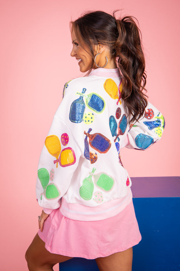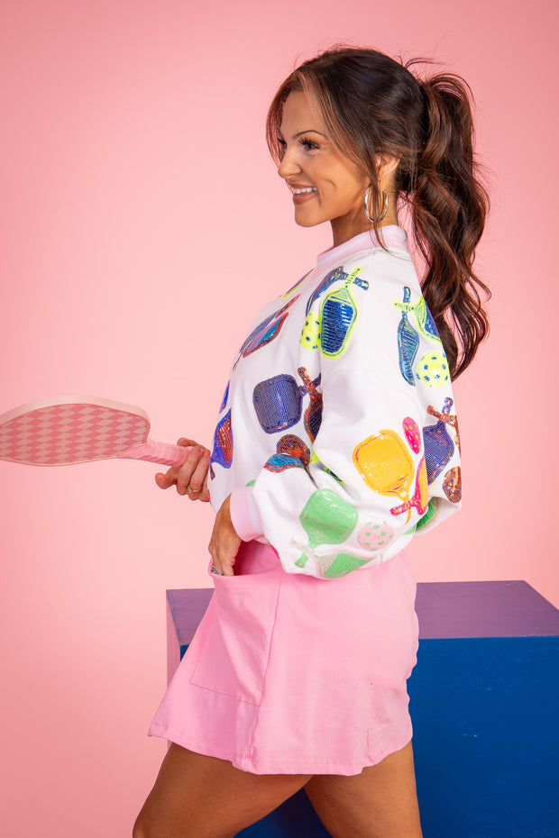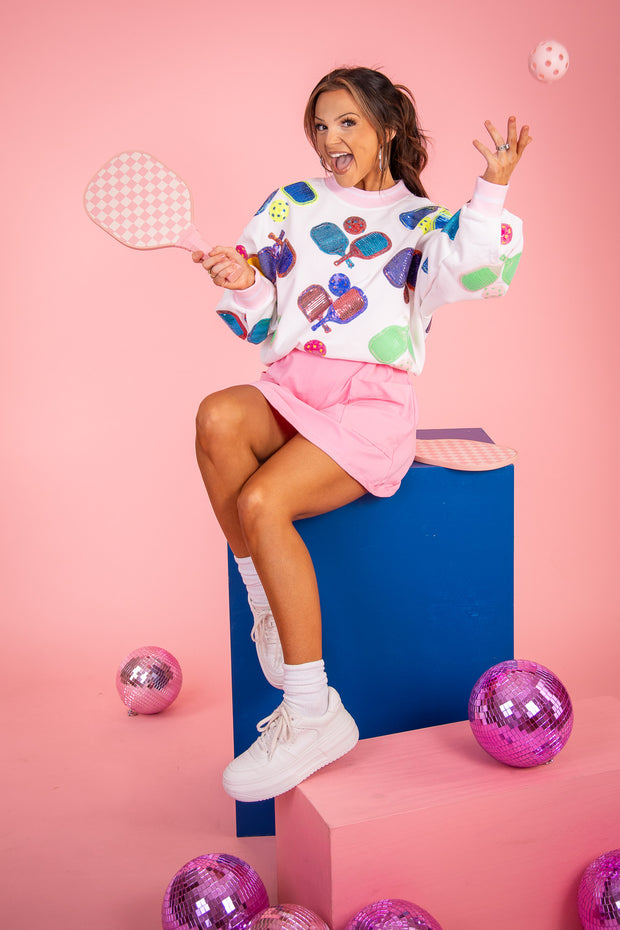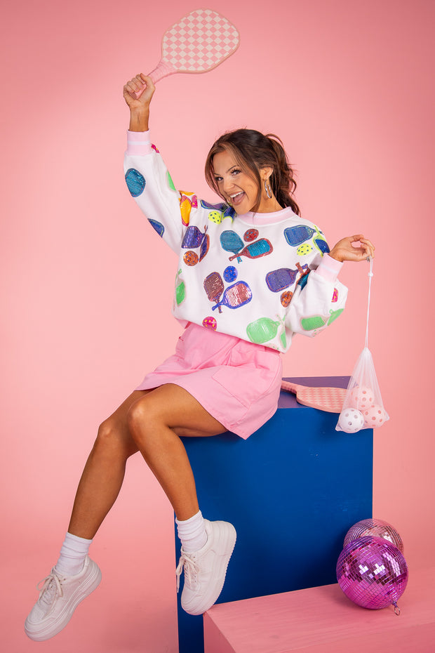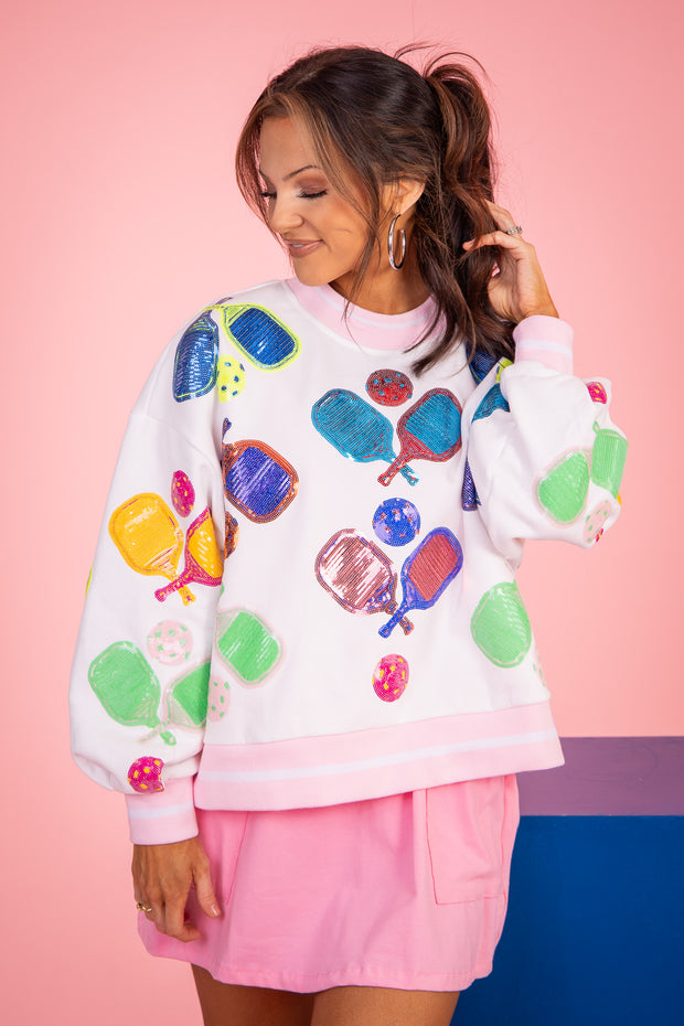 Elevate your pickleball game with our Queen Of Sparkles sweatshirt. Featuring a flattering striped crew neckline and long sleeves, this sweatshirt is adorned with sequin paddles and pickleballs for a touch of sparkling style. The banded bottom adds a sporty finish. Play in style and sparkle on the court.