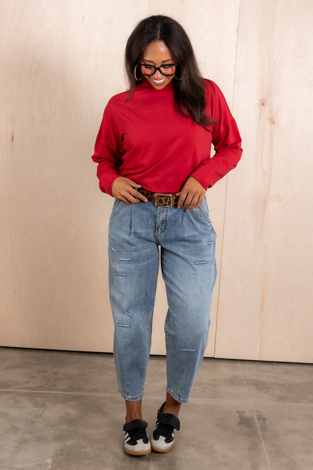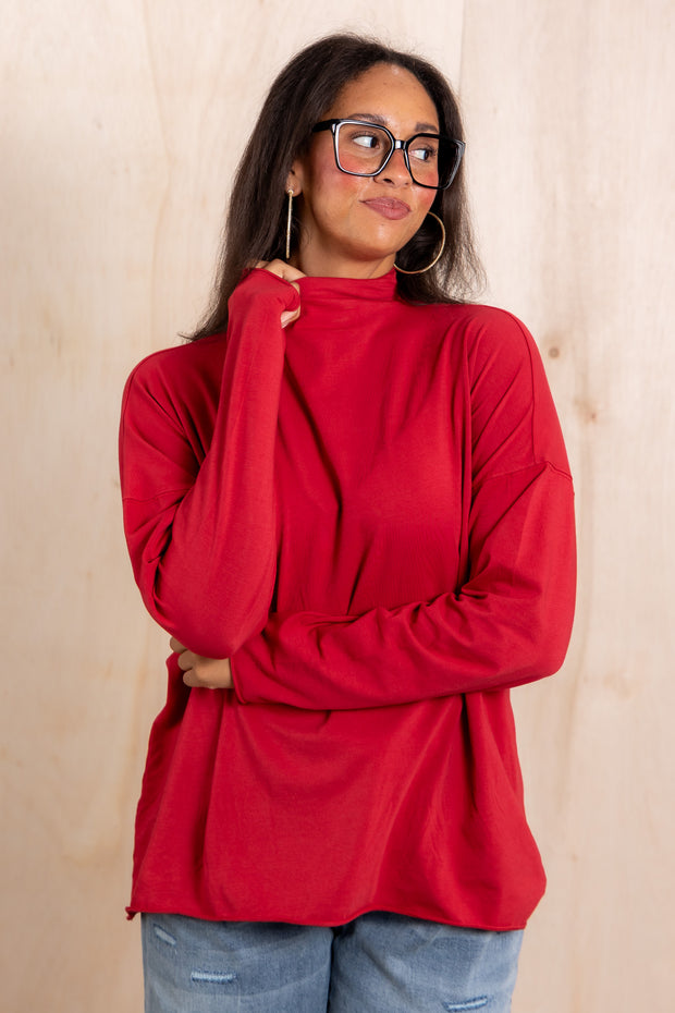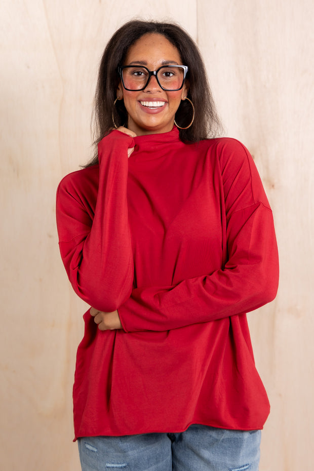 This top features long sleeves and a waist-length cut, offering a comfortable and stylish fit. Its garnet red color adds a warm, vibrant touch to your wardrobe, perfect for layering or wearing on its own.