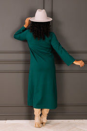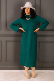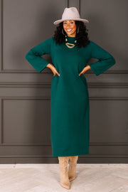 The Pine Green Long Sleeve Maxi Sweater Dress features a soft, comfortable fabric and a classic round neckline. Its maxi length and cozy design make it perfect for staying warm while looking effortlessly stylish.