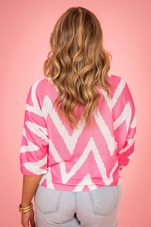 Introducing the Clearly Yours Sweater, the perfect addition to your wardrobe. Designed with a rounded neckline and three quarter length sleeves, this sweater offers both style and comfort. The knitted material and unique chevron print make it a versatile piece for any occasion. Elevate your look today with this must-have sweater.