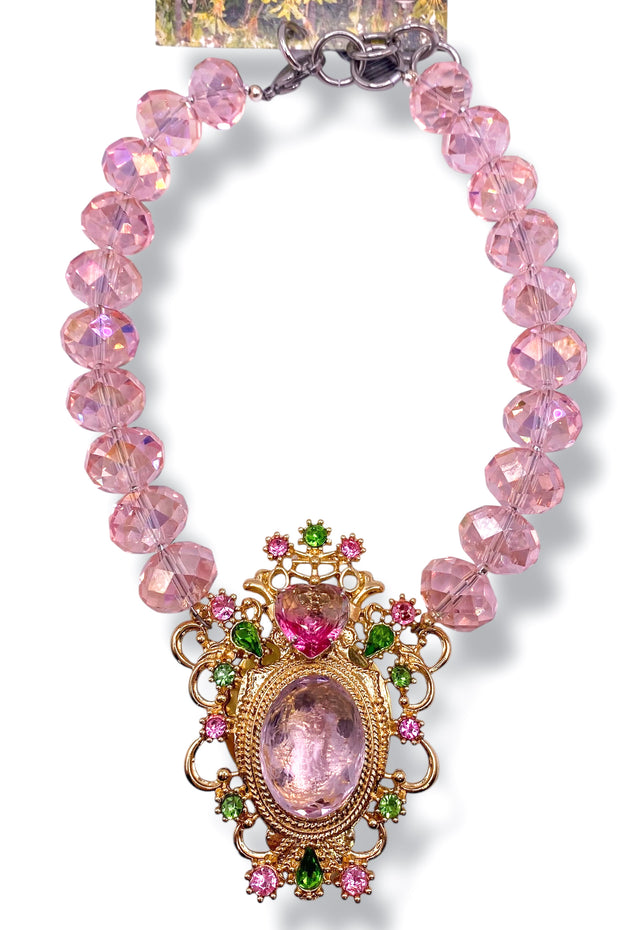 Rockstar In Rome Pink Topaz/Tourmaline Brooch Chandelier Crystal Necklace