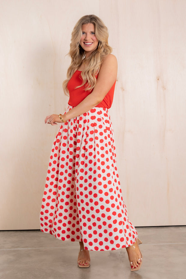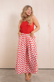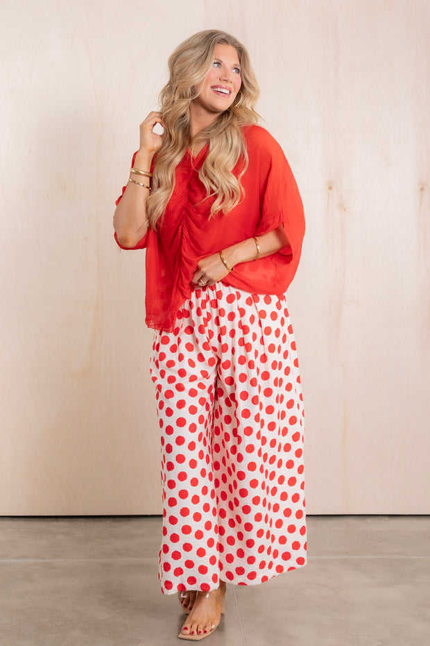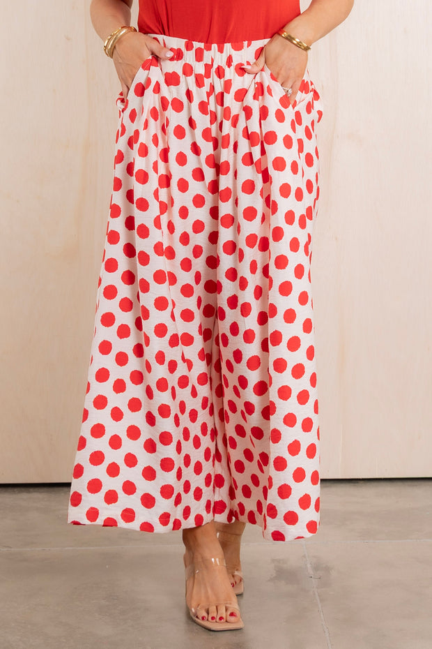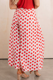 Featuring a playful red polka dot print, pleated waist detail, and an elastic pull on waistband, these pants are both stylish and comfortable. Made from breathable materials, they are perfect for any occasion.