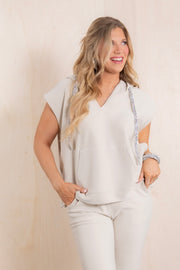 With a rhinestone drawstring and side buttons, this top is both stylish and functional. Its hood and front pocket add extra features, all while providing comfort with its sleeveless and soft material.