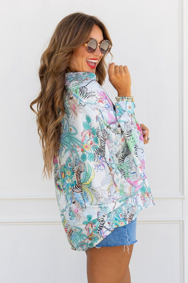 This blouse is so beautiful and unique! We are loving the print, collar, and button down style. We love this top styled with a statement pant and statement jewelry for a night on the town.
