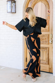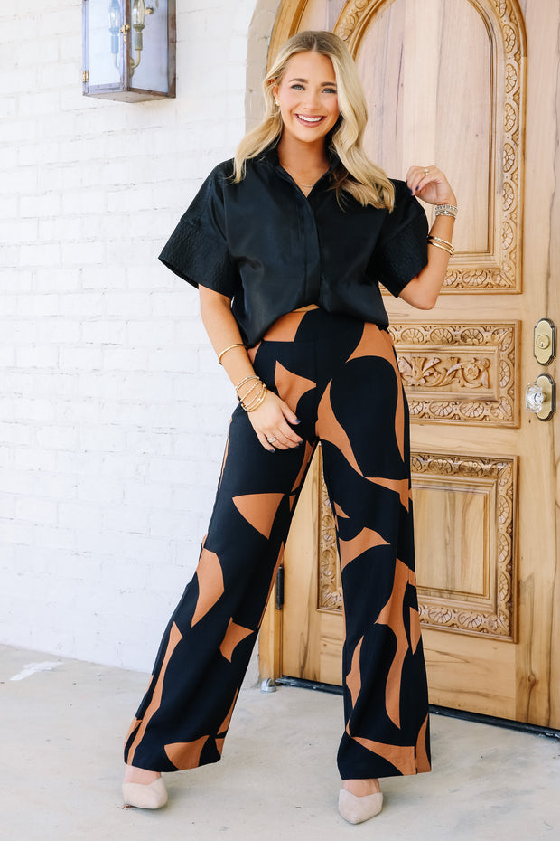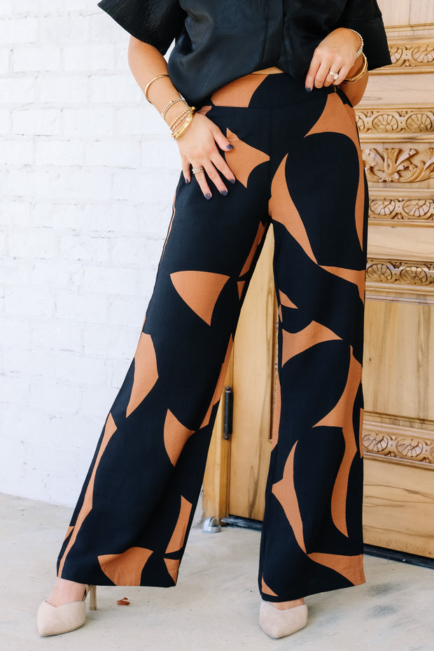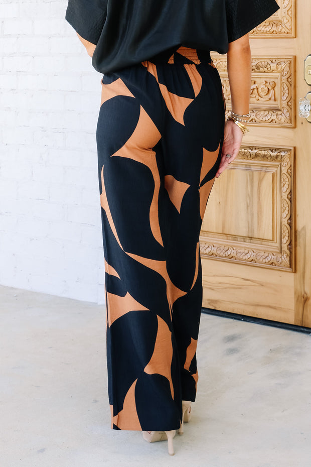 Add a touch of personality to your look with these pants, featuring a bold abstract pattern. The flowy flare leg brings retro flair, while front slash pockets offer convenient storage. A smocked elastic detail at the pull-on waist ensures a comfortable, flattering fit.