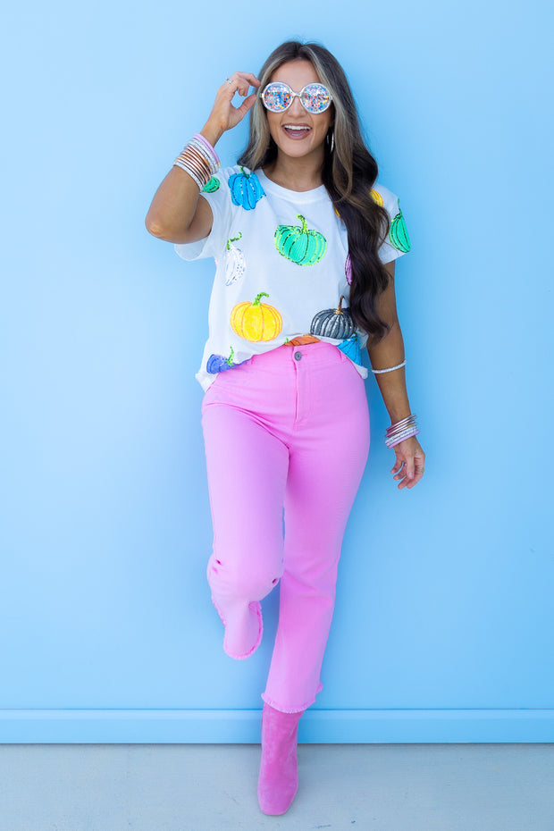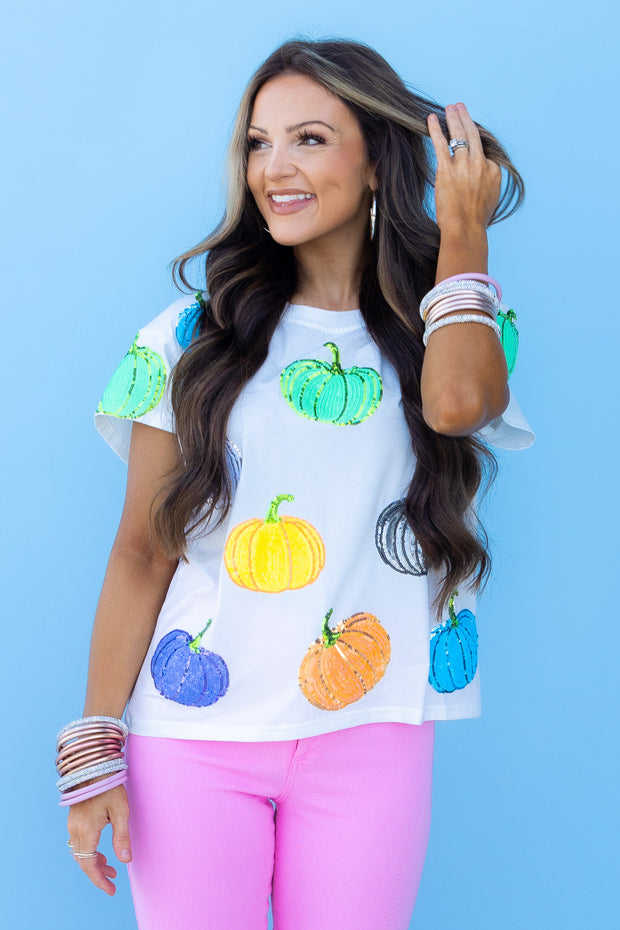The Pumpkin Tee by Queen Of Sparkles is an essential addition to your wardrobe. Featuring a rounded neckline and short sleeves, this tee offers both comfort and style. The sequin pumpkin detailing throughout adds a touch of sparkle to any outfit. Elevate your fall fashion game with this must-have piece.