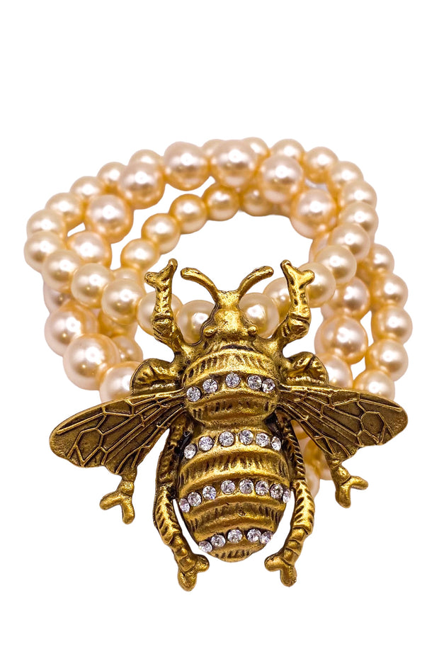 This bracelet is an absolute stunner. This is a 3 strand pearl layered bracelet, with a bee pendant, that features 5 crystals that are dripped in to give some sparkle! this bracelet will look beautiful with any outfit.