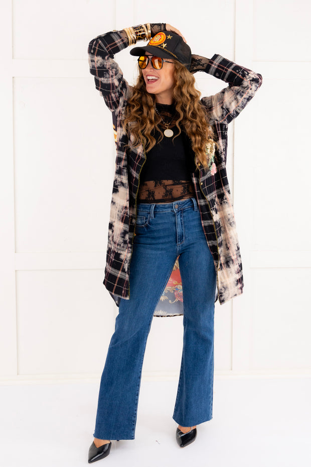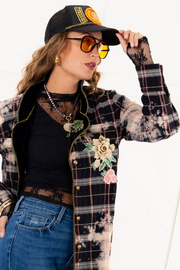 The Queen Rules Shirt Dress combines fashion and function with its button down front, longer length, and long sleeves. The floral detailing adds a touch of femininity, while the plaid print and acid washing make a statement. Perfect for a stylish and confident woman.
