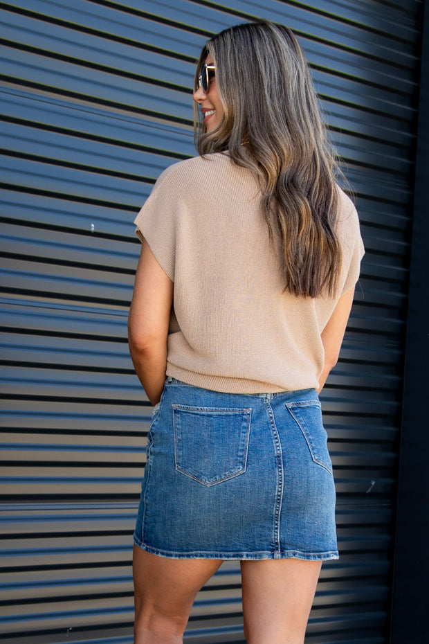 Super high rise skirt in classic cut. The coveted fit that graces the waist and effortlessly embraces the the hip and thigh. Skirt inseam on comfort stretch denim of desirable elegance accented with hand sanding whiskers at hip, hem grindings, side seam inserts, rivet trimmed slant pocket