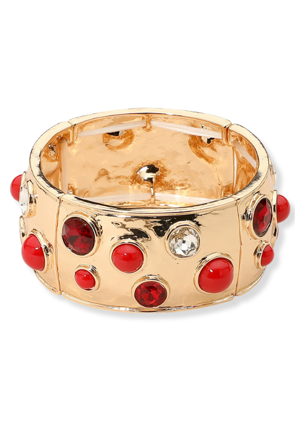 This bracelet features a wide stretch design adorned with sparkling gemstones, creating a bold and elegant look. Its flexible fit ensures comfort while making a striking accessory for any outfit.